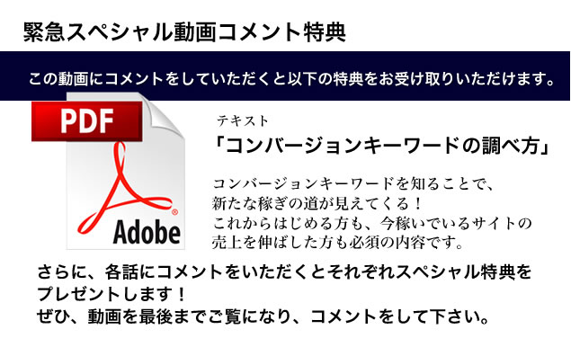 第1回「最短1日で上位表示させる裏技」 第2回「たった千円で100万稼いだ方法」 第3回「続、たった千円で100万稼いだ方法」 第4回「稼げるキーワードを見つける方法」 第5回「全くの初心者ですが大丈夫でしょうか?」 第6回「SEOは今も昔もリンク重視」コメント特典一覧