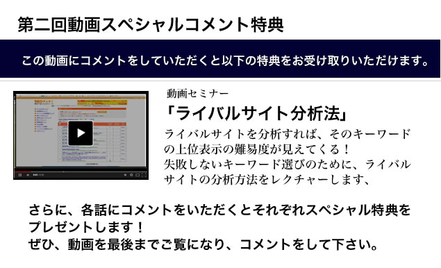 第1回「最短1日で上位表示させる裏技」 第2回「たった千円で100万稼いだ方法」 第3回「続、たった千円で100万稼いだ方法」 第4回「稼げるキーワードを見つける方法」 第5回「全くの初心者ですが大丈夫でしょうか?」 第6回「SEOは今も昔もリンク重視」コメント特典一覧