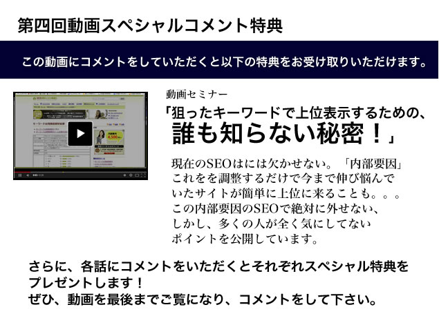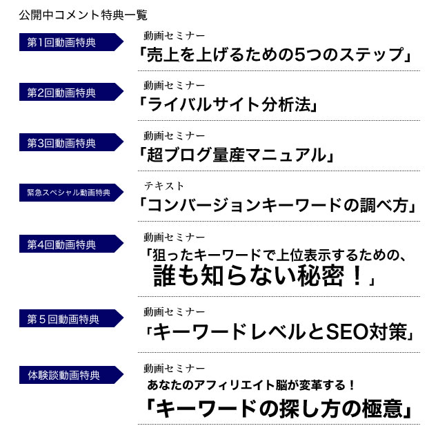 第1回「最短1日で上位表示させる裏技」 第2回「たった千円で100万稼いだ方法」 第3回「続、たった千円で100万稼いだ方法」 第4回「稼げるキーワードを見つける方法」 第5回「全くの初心者ですが大丈夫でしょうか?」 第6回「SEOは今も昔もリンク重視」コメント特典一覧