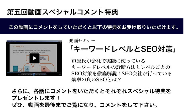 第1回「最短1日で上位表示させる裏技」 第2回「たった千円で100万稼いだ方法」 第3回「続、たった千円で100万稼いだ方法」 第4回「稼げるキーワードを見つける方法」 第5回「全くの初心者ですが大丈夫でしょうか?」 第6回「SEOは今も昔もリンク重視」コメント特典一覧