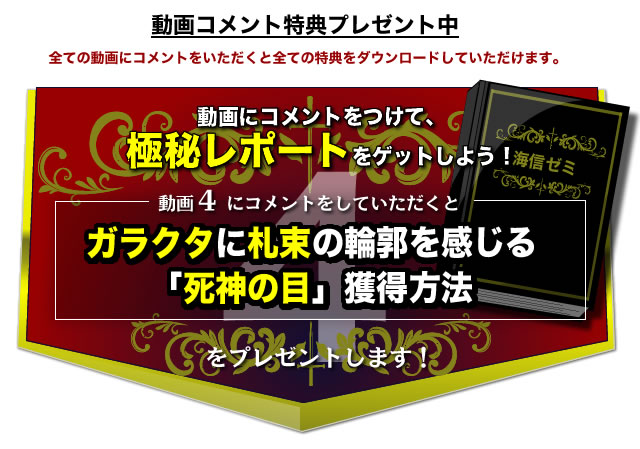 特典1 サルでも出来る無料ブログで月収10万円にする裏技」 特典2 無理やりお金になるアクセスを自サイトに引っ張り込む裏技 特典3 買う気満々のお客だけ狙う戦略的サイト作成術 特典4 ガラクタに札束の輪郭を感じる「死神の目」獲得方法 特典5 アフィリエイト・深く掘るか横に広げるか?