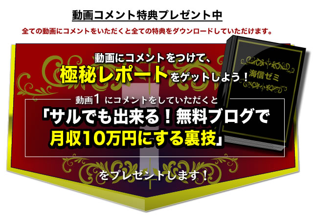 特典1 サルでも出来る無料ブログで月収10万円にする裏技」 特典2 無理やりお金になるアクセスを自サイトに引っ張り込む裏技 特典3 買う気満々のお客だけ狙う戦略的サイト作成術 特典4 ガラクタに札束の輪郭を感じる「死神の目」獲得方法 特典5 アフィリエイト・深く掘るか横に広げるか?
